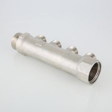 (VTc.500.N) Латунный никелированный коллектор на 2, 3 или 4 выхода диаметром 1/2" с наружной резьбой. Диаметр коллектора – 3/4 или 1", резьба – внутренняя/наружная. Рабочая температура теплоносителя – до 130 °С, давление – до 16 бар. Применяется для распределения потоков жидкостей в контурах теплого пола, радиаторного отопления, холодного и горячего водоснабжения.