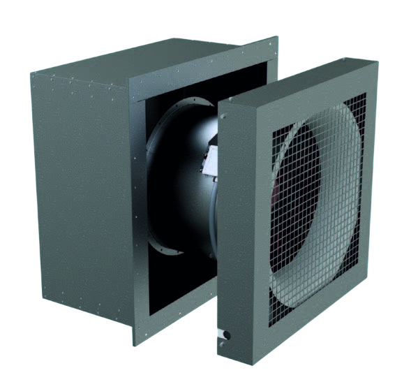 Вентилятор содержит установленный на вертикальной монтажной плите цилиндрический корпус, внутри которого на опоре закреплён электродвигатель, на выходном валу которого закреплено осевое колесо. На входе в цилиндрический корпус, со стороны помещения, закреплён конфузор, который закрывается защитной решёткой.