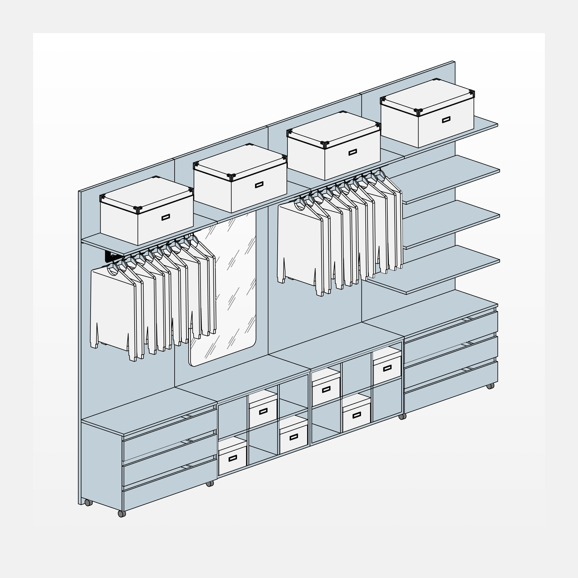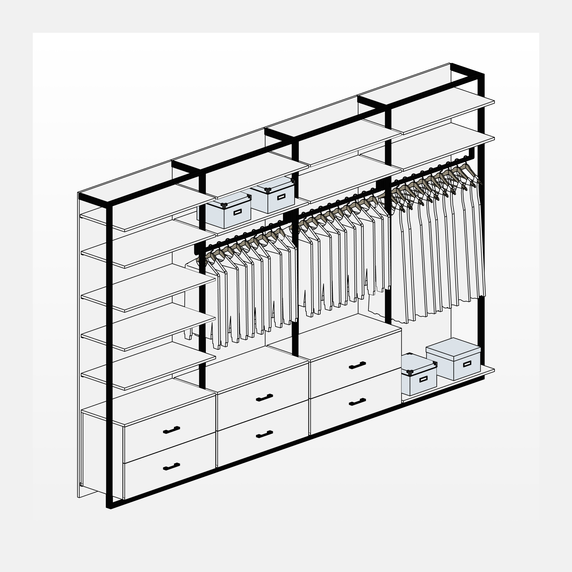 Набор содержит три типа гардероба: каркасный, корпусный и панельный. Кроме этого в наборе есть множество вариантов наполнения. Это полки, полки для обуви, выдвижные ящики, брючница, пантограф, корзины.