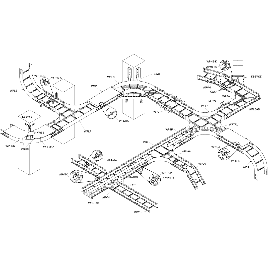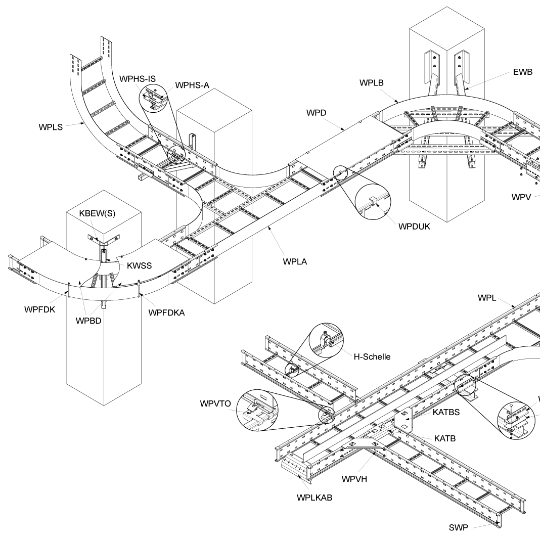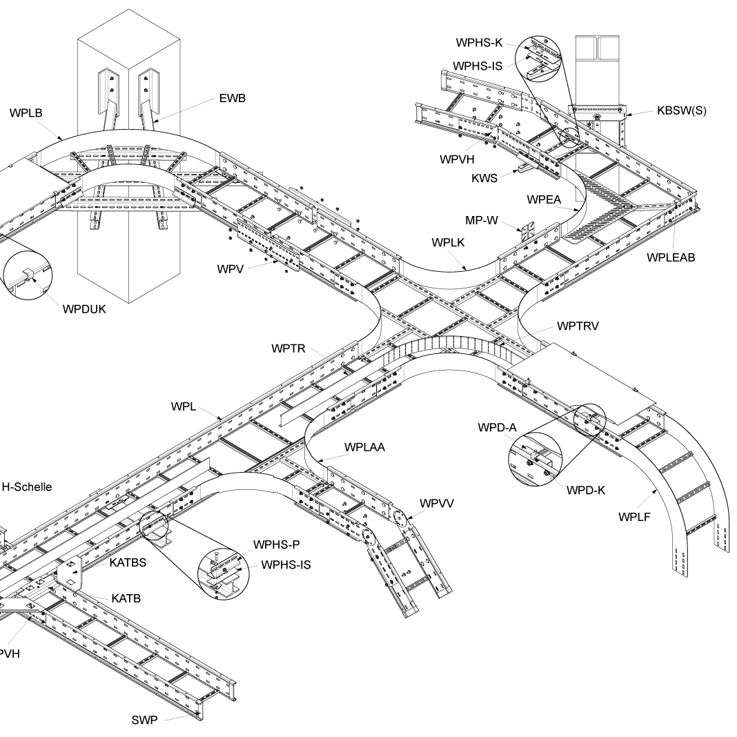 Для организации поворотов, ответвлений для проектирования силовых и слаботочных кабельных трасс / линий внутри помещений и на открытых площадках.