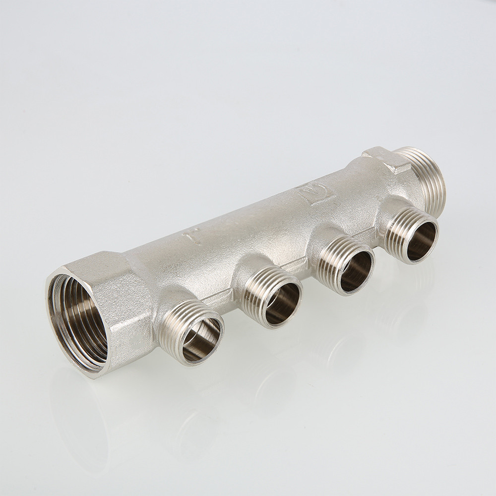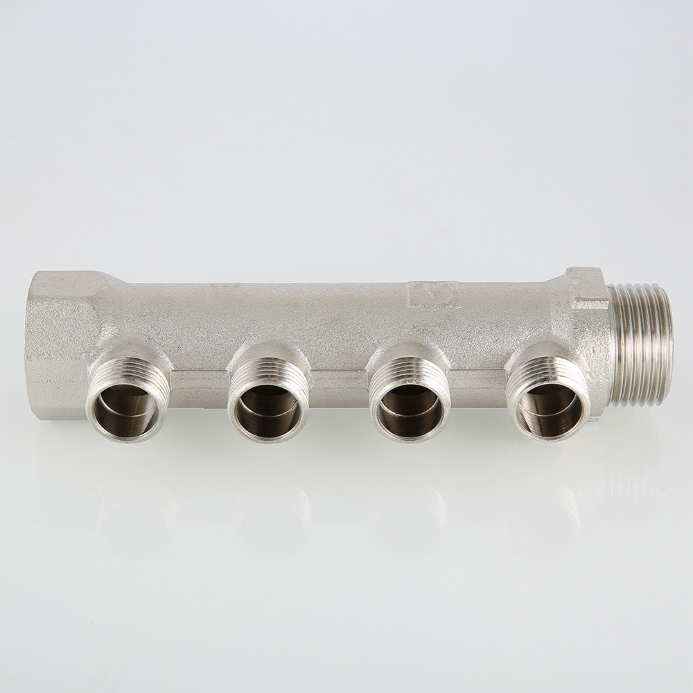 (VTc.500.N) Латунный никелированный коллектор на 2, 3 или 4 выхода диаметром 1/2" с наружной резьбой. Диаметр коллектора – 3/4 или 1", резьба – внутренняя/наружная. Рабочая температура теплоносителя – до 130 °С, давление – до 16 бар. Применяется для распределения потоков жидкостей в контурах теплого пола, радиаторного отопления, холодного и горячего водоснабжения.