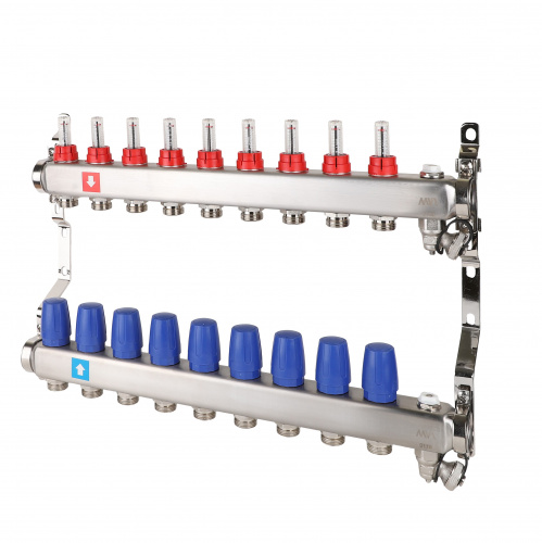 Коллектор из нержавеющей стали в сборе с расходомерами, дренажным краном и воздухоотводчиком, 9 выходов