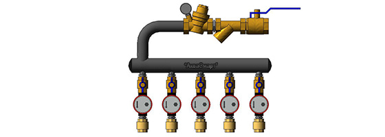 Коллекторные узлы «АкваСмарт» подключаются к стоякам систем ХВС и ГВС и распределяют водоснабжение на каждого потребителя индивидуально. Диаметры коллекторов могут быть Ду 20-50 (3/4 до 2) в зависимости от количества потребителей. Отводы на квартиру - Ду 15. Отводы на коллекторы имеют межосевой расстояние 90 – 100 мм. Как правило, коллектор оснащен запорной арматурой на вводе и на отводах в квартиру. На вводе имеется фильтр грубой очистки. Регулятор давления устанавливается на вводе коллектора, либо на каждом отводе в квартиру. Дополнительно на коллектор могут устанавливаться приборы контроля за параметрами системы водоснабжения, например, манометры. Приборы учета (водосчетчики) могут поставляться в комплекте, либо, при необходимости, вместо них коллекторы комплектуются пластмассовой вставкой с накидными гайками, к которым водосчетчик может быть смонтирован управляющей организацией или потребителем.