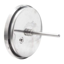 Тип БТ, серия 211. Термометр биметаллический (осевое присоединение) в комплекте с защитной латунной* погружной гильзой. Прибор предназначен для измерения температуры жидкостей, пара и газов в отопительных и санитарных установках, в системах кондиционирования и вентиляции. Принцип действия прибора основан на зависимости деформации чувствительного элемента от измеряемой температуры. В качестве чувствительного элемента используется биметаллическая пружина. Она изготавливается из двух прочно соединенных металлических пластин, имеющих различные температурные коэффициенты линейного расширения. При изменении температуры пружина изгибается и вращает стрелку термометра. Один её конец закреплен внутри штока, а к другому присоединяется ось стрелки. Корпус прибора изготавливается из коррозионностойкой стали, шток — из нержавеющей стали.