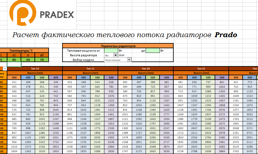 Расчет фактического теплового потока радиаторов PRADO и PRADEX (табл. excel)