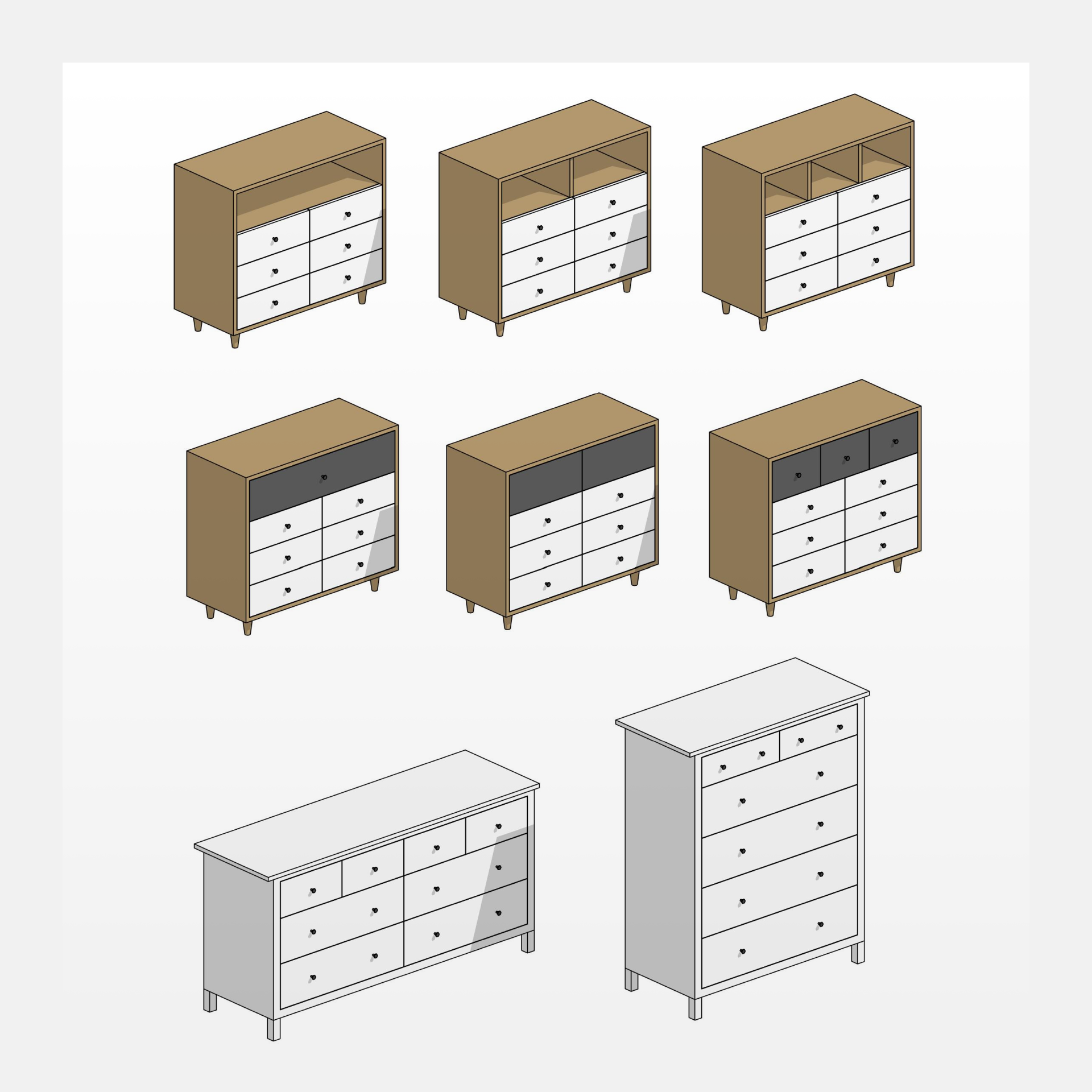 Параметрические семейства тумб и комодов для Revit. Позволяют создавать много разных видов мебели для хранения изменяя различные параметры семейств, такие как: прикроватные тумбочки, тумба с ящиками, тумба под ТВ, комоды различной формы и конфигурации ящиков