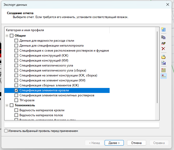 Для вывода спецификации используйте в экспорте данных отчет Спецификация элементов кровли.