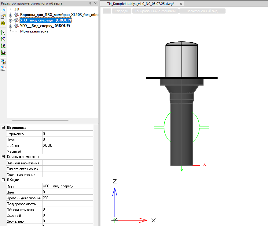 Воронки имеют ручку отключения листоуловителя, узел присоединения трубопровода, а также все объекты являются параметрическими (длиной элемента можно управлять через параметр «Высота»).