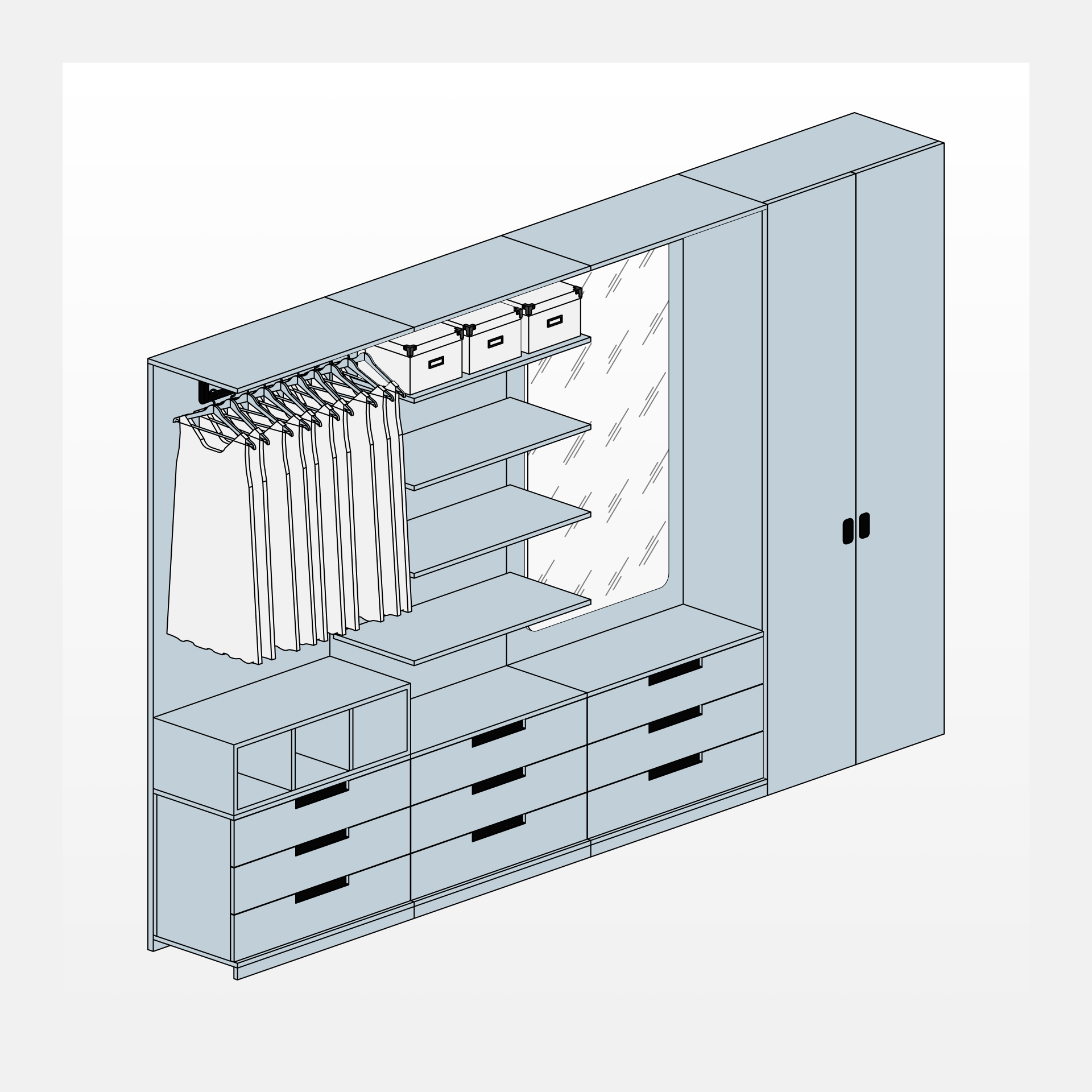 Набор содержит три типа гардероба: каркасный, корпусный и панельный. Кроме этого в наборе есть множество вариантов наполнения. Это полки, полки для обуви, выдвижные ящики, брючница, пантограф, корзины.