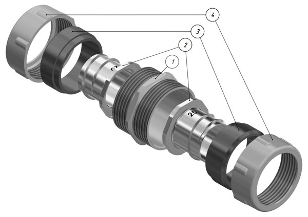 Муфты соединительные МСМ является трубной арматурой для надежного соединения частей гибкой гофрированной металлической или композитной трубной системы прокладки кабелей по ГОСТ Р МЭК 61386.1-2014 (для соединения между собой металлорукавов типов МРПИ, МПГ, ШЭМ, РЗ-Ц, РЗ-ЦХ, РЗ-ЦА, РЗ-ЦП или других). Температура монтажа, транспортировки и эксплуатации -25°С~100°С Температура эксплуатации в стационарном состоянии -40°С ~100°С Климатическое исполнение: У2 Степень защиты: IP 54 Код классификации по ГОСТ Р МЭК 61386.1-2014: 024101542203 Материал корпуса: сплав цинка. Материал уплотнения: резина МБС В комплект одного изделия входят: корпус (1), оконцеватель (2) - 2 шт., уплотнение металлорукава (3) - 2 шт., накидная гайка (4) - 2 шт.