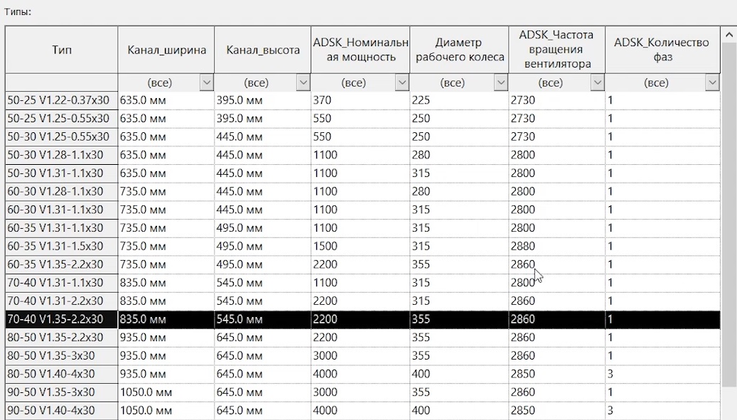 Все семейства содержат таблицы выбора (в формате .csv). Семейства загружаются в проект с помощью каталога типоразмеров (в формате .txt). Это позволяет проектировщику выбрать и загрузить в проект изделия только с теми параметрами, которые ему необходимы.