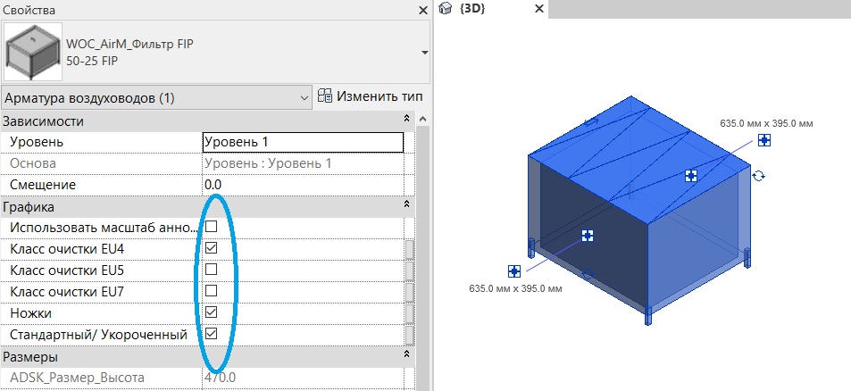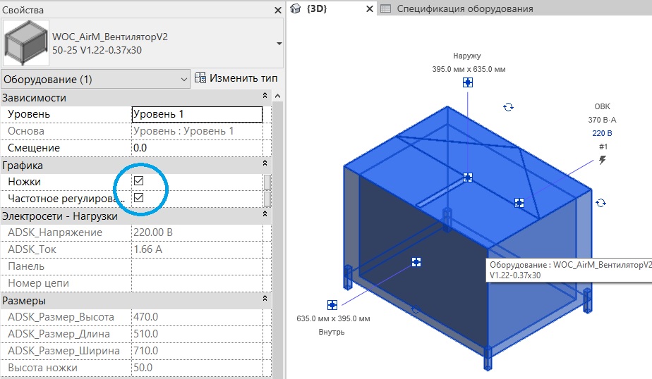 Установки могут быть напольными и иметь ножки или устанавливаться сверху на другое оборудование. В этом случан ножек нет. В семействах это регулируется в разделе Графика при помощи функции Да/нет (галочкой). Также при помощи функции Да/нет выбирается оборудование с частотным регулированием или без него